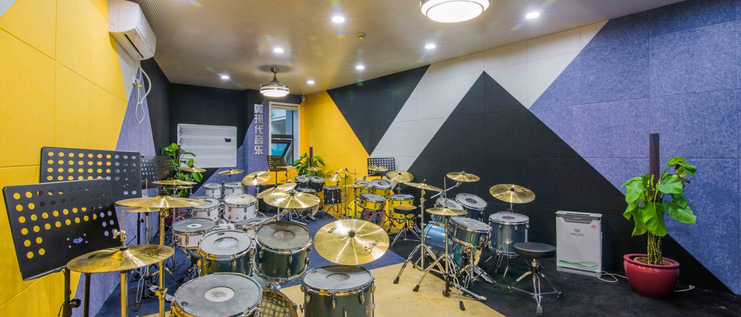 翼现代音乐是一个儿童架子鼓培训品牌,共有三家分店,目前为止已经培训了数百名学员。设计师对每一间音乐教室进行了规划,使得它们具有良好的声场。同时,翼现代设有专门的录音室,可以进行录音和MV拍摄。上尚庭店落成图