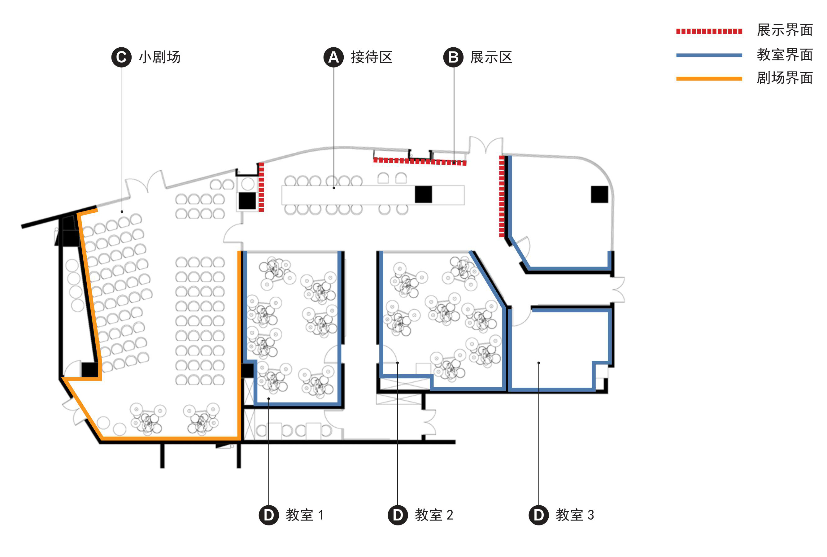 排布原则:开放式的接待区、展示区位于功能枢细处,链接其他功能。教室、小剧场用隔音玻璃分割,不同的功能之间视线开放、互融,消除隔阂感。