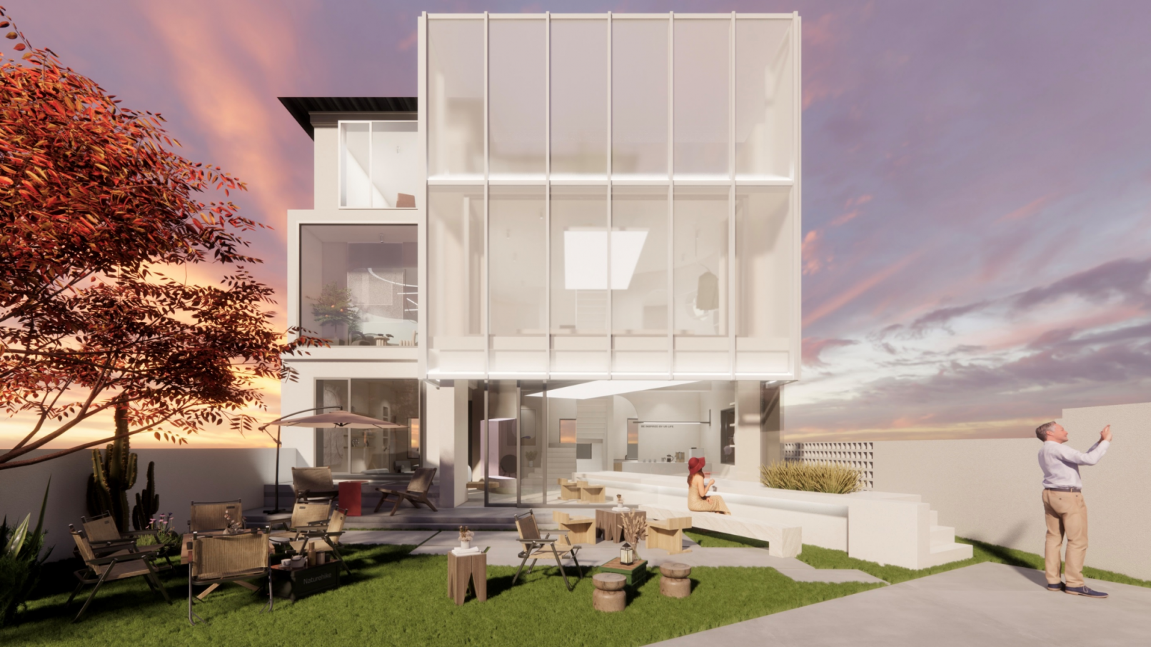 由于现有别墅的空间太窄,将外部阳台拓宽到内部空间,赋予空间扩张感,通过差别化战略,将舞台和桌子功能相结合的大型舞台桌子从室内向外部院子,使外部庭院和内部空间的连接、空间的界限模糊,弥补了狭窄空间的缺点。为了建筑物的雄伟,设置了半透明材料的polycarbonate结构,通过间接照明表现夜间景观的美丽,遮挡了现有居住空间的要素,强调了商业空间的要素。为了适合拍照,将照明光量调节和极简的空间要素排除装饰部分,作为亮点要素,将引领年轻潮流的个性软装作为重点。