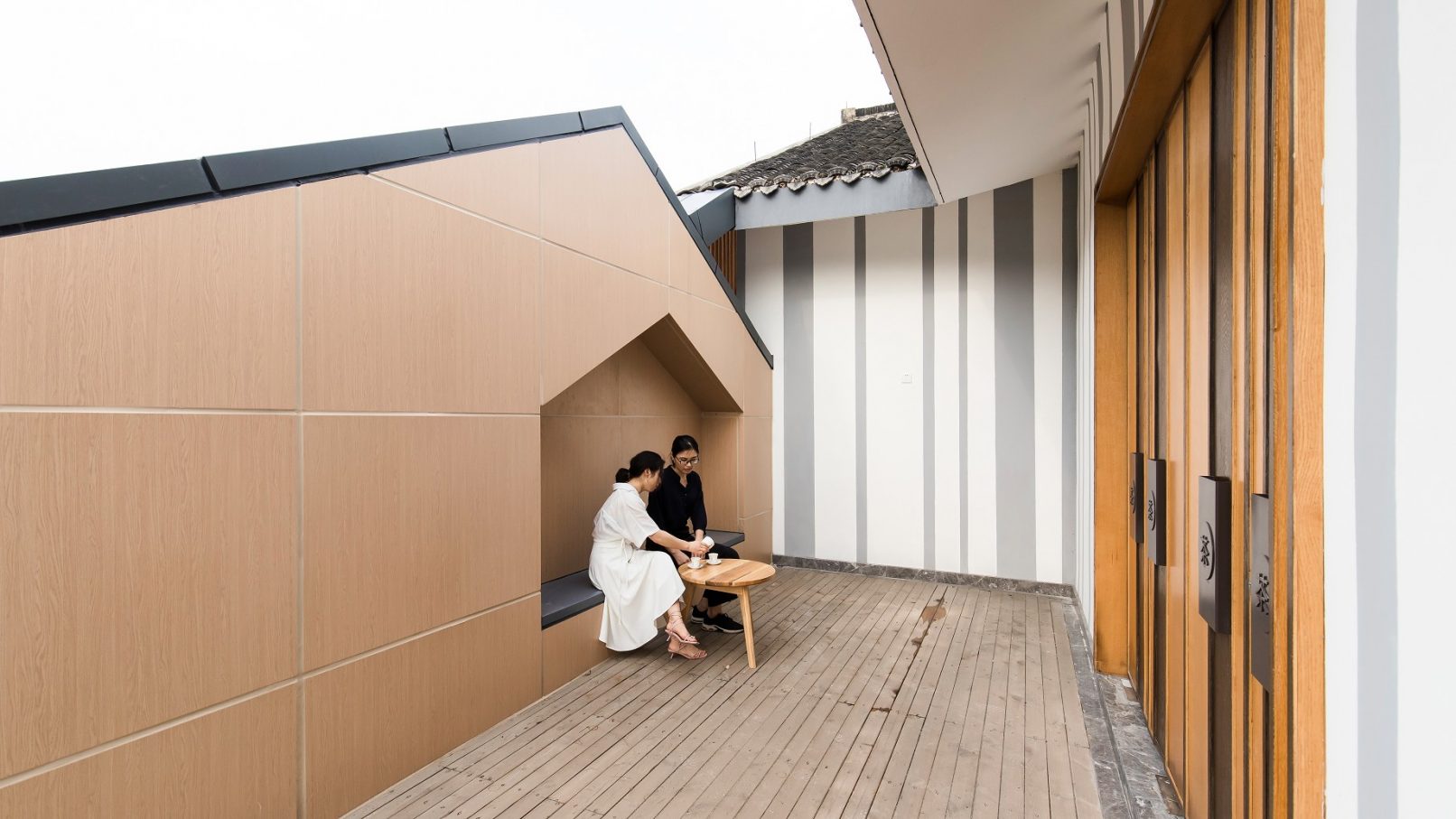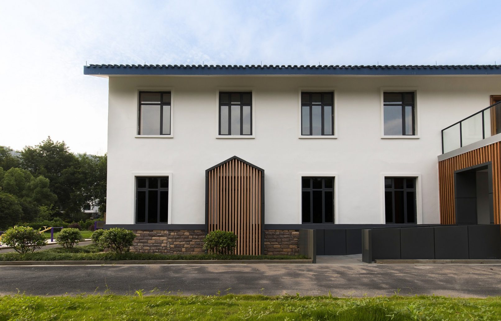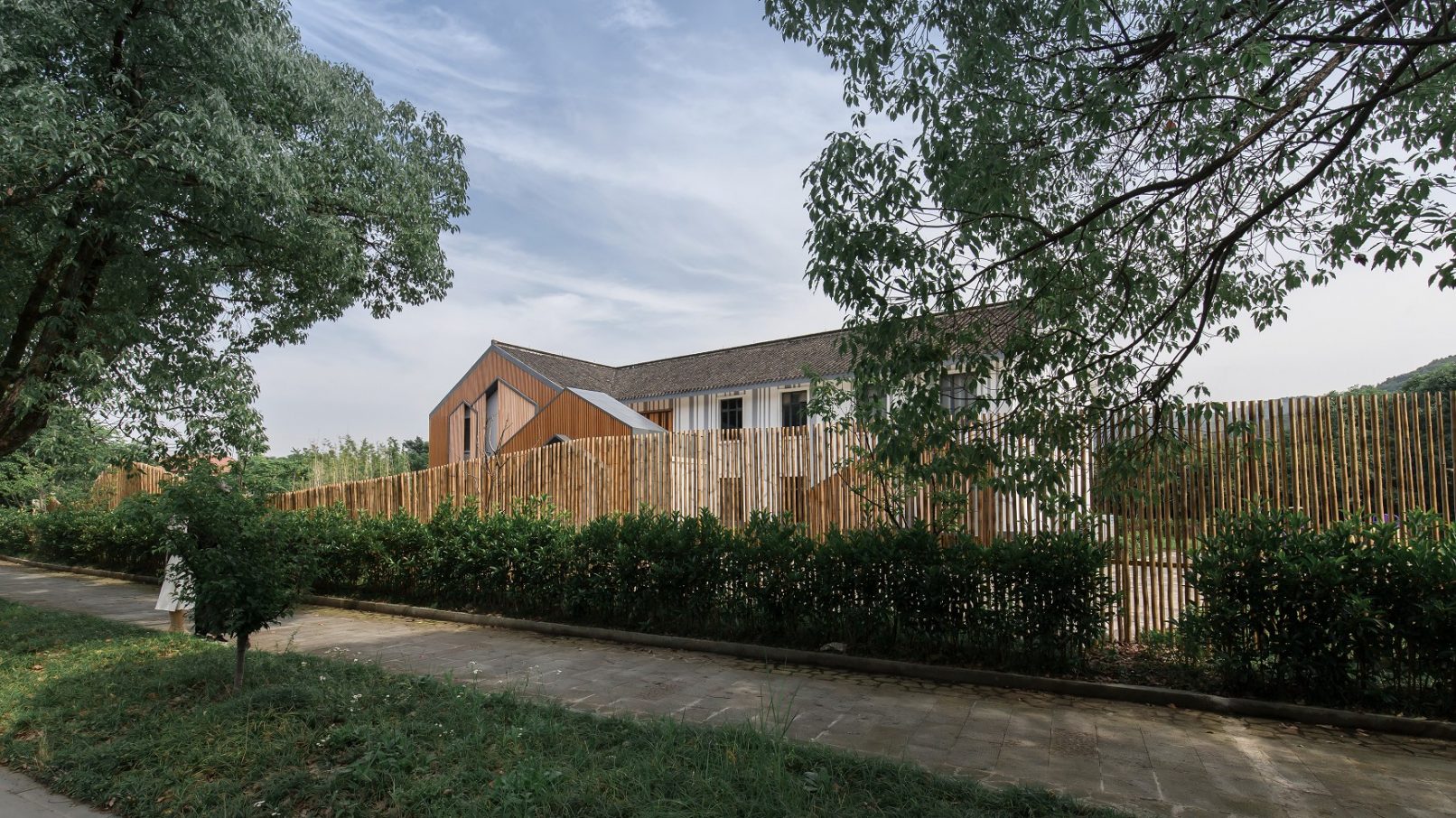 九曲红梅茶文化馆由茶村的普通农舍改建而成。外部形象以“远山茶田 依山而制”作为设计出发点。连绵重叠的坡屋顶既是远山和茶田的写意,也是建筑所在地依山而建的传统居所与制茶工坊的再现。材料选用具有现代性的金属铝板,给灵山村这个传统的制茶环境带来了精致的现代感, 其温和的木色和瓦灰色则呼应了本地的制茶传统。